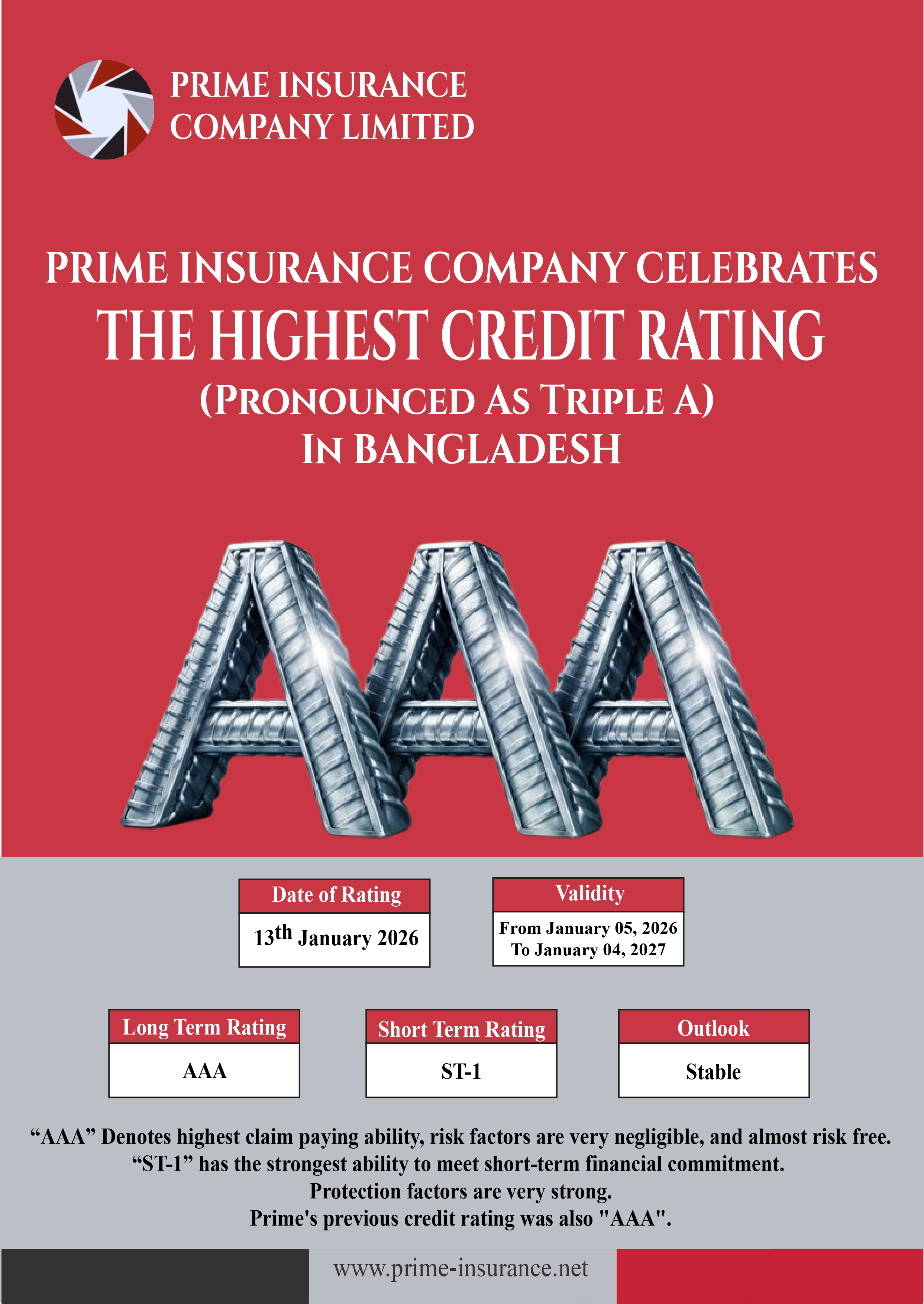 In Accordance with the notification no. BSEC/CMRRC/2009-193/37/Admin/132 dated 12th May 2022 of Bangladesh Securities and Exchanges Commission (BSEC), based on Audited Financial Statements for the year ended 31st December 2024 and 3rd Quarter Financial Statements 2025, Prime Insurance Company Limited uphold its credit rating AAA in 2026 like as 2025. Validity of the report from 05 January 2026 to 04 January 2027. Summary of credit rating report of Prime Insurance Company Limited are as follows: